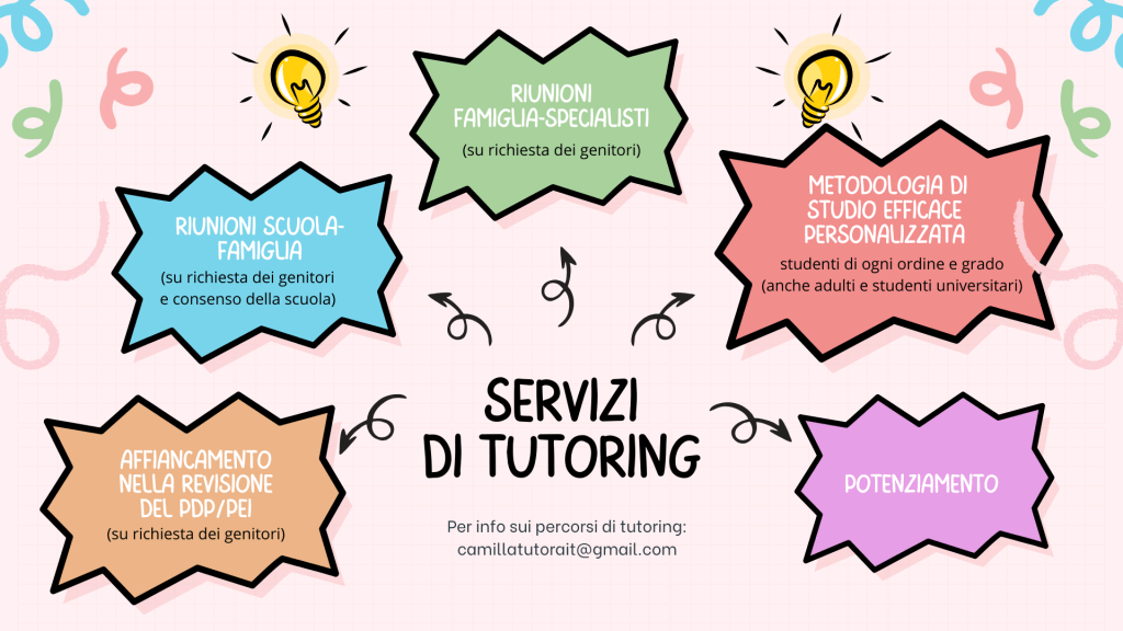 Sono Camilla e sono una tutor dell’apprendimento professionista specializzata nella Sindrome di Deficit di Attenzione e Iperattività (ADHD) e nei BES (Bisogni Educativi Speciali), tra cui i DSA (Disturbi Specifici dell’Apprendimento).