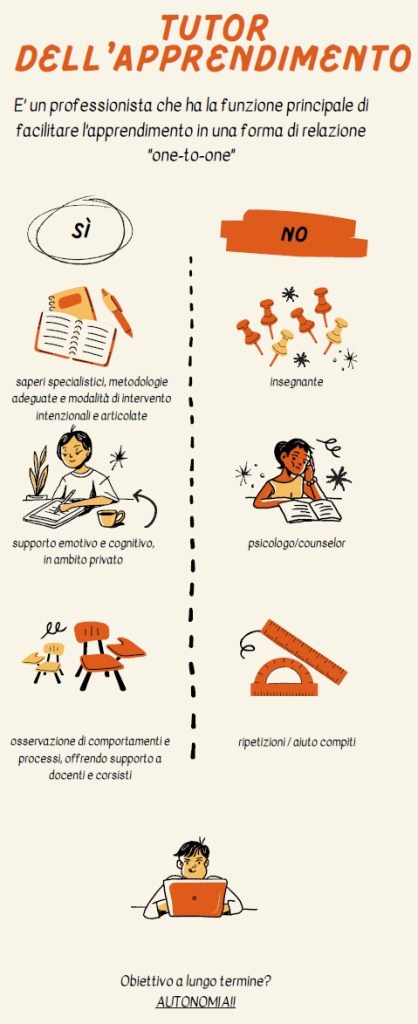 Il Tutor dell’apprendimento è un tecnico specializzato nelle strategie per il supporto didattico, nelle metodologie di apprendimento individuale, con un’attenzione specifica al valore dell’esperienza e del fare della persona.
